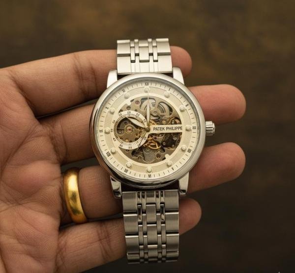 Patek Philippe Silver Skeleton Dial Automatic Metal Strap Luxury Watch
