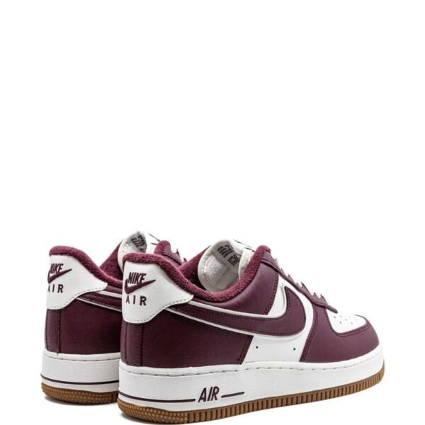 A heritage silhouette, the Air Force 1 Low is presented in contrasting Sail and Night Marron tones here. This model features the classic low-top silhouette, enhanced by a Swoosh logo on the sides, and sits atop a white rubber sole and a gum outsole.